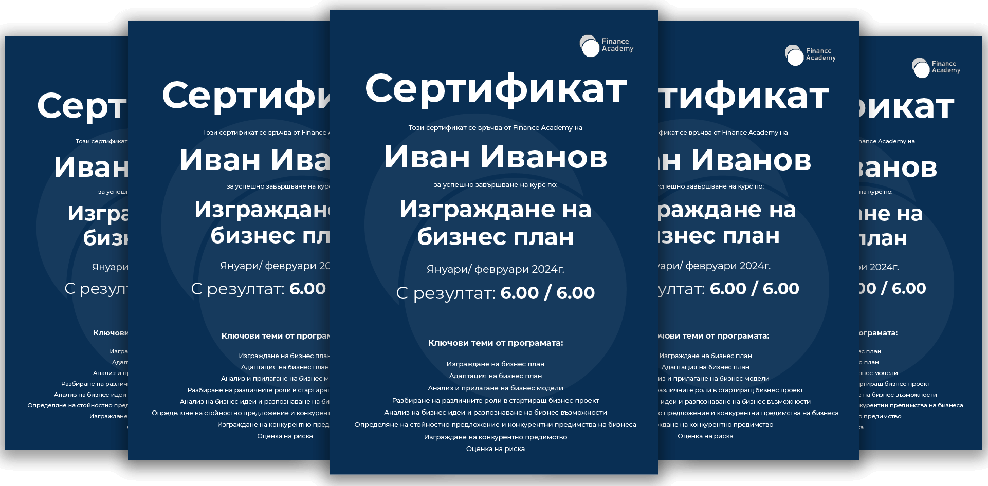 • Официални грамоти/сертификати на Finance Academy от всеки курс